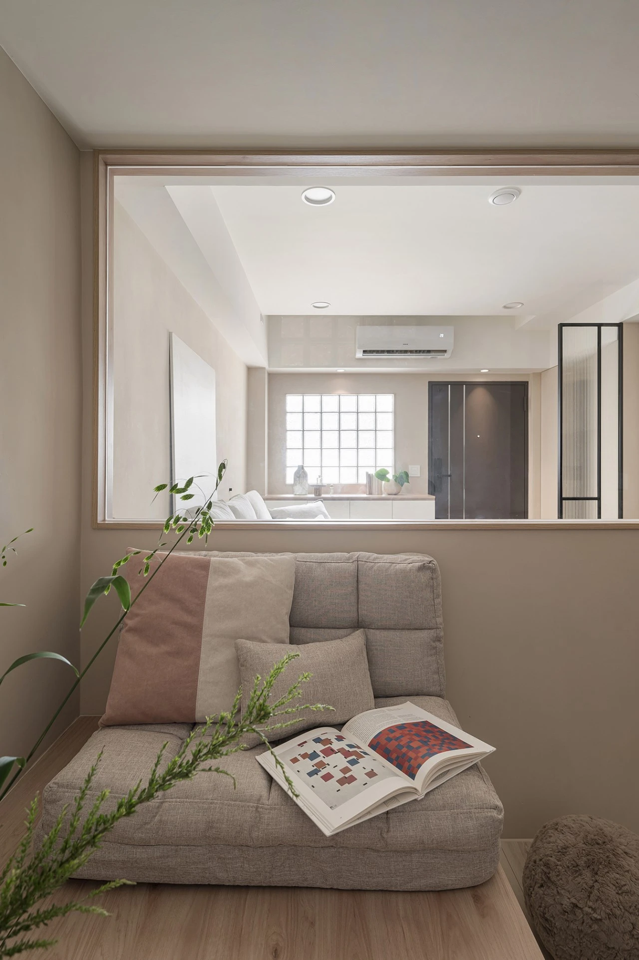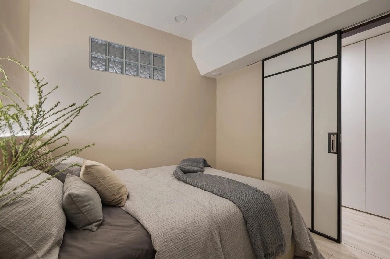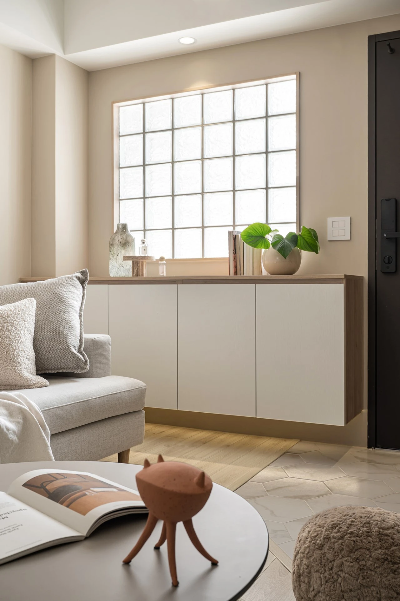 空間性質|住宅空間 舊屋翻新 座落位置|台北市大同區 室內面積|18坪 室內格局|2房2廳1衛 使用建材|系統櫃、玻璃磚、乳膠漆、超耐磨木地板、造型鐵件、烤漆玻璃、進口花磚